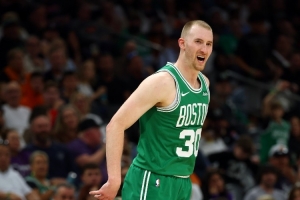 凯尔特人球员豪泽本场比赛在外线手感依旧火热,他仅出战三节时间就射落8记三分。