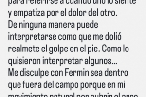 穆索写道:“感同身受”—这是一句在阿根廷常用的表达,用来形容一个人对别人的痛苦感到同情和理解,这句话绝对不能被误解为我的脚真的受伤了。就像有些人试图解读的那样......我在场上和场下都向费尔明道歉了,因为在我自然移动以保护球门时,我们发生了碰撞,这导致他受伤。