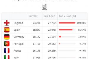 本赛季欧战系数平均积分前二下赛季将有一个额外欧冠名额,目前英超已锁定欧冠额外名额,而西甲则有超过八成的概率获得此名额。